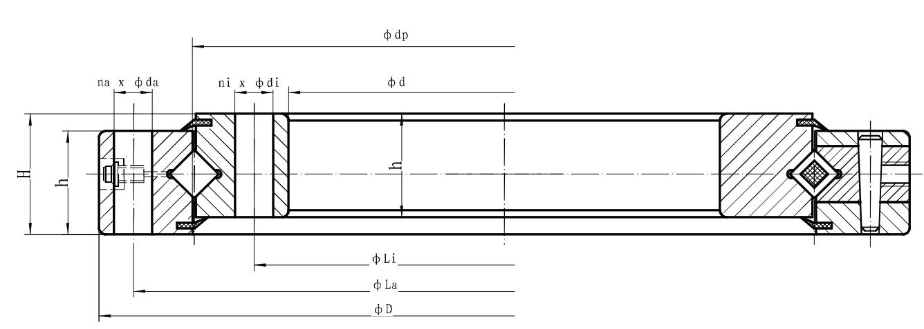 | Inner ring d(mm) | Outer ring D(mm) | Roller pitch circle dp(mm) | Width B (mm) | φLa | Number na | φLi | Number ni | Ca KN | Coa KN | Cr KN | Cor KN | ||